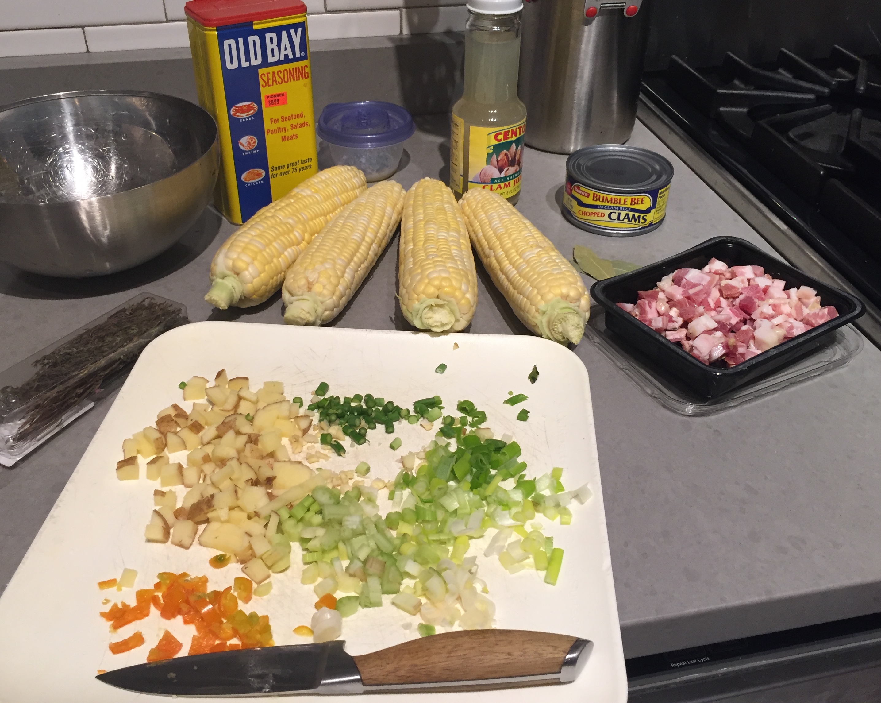 Add corn. Cook for another 2 minutes. Then add in wine, clam juice, minced clams, bay leaves and thyme. Cook for 20 minutes. Add the fresh clams and cover until steamed through. Remove the fresh clams and set aside.