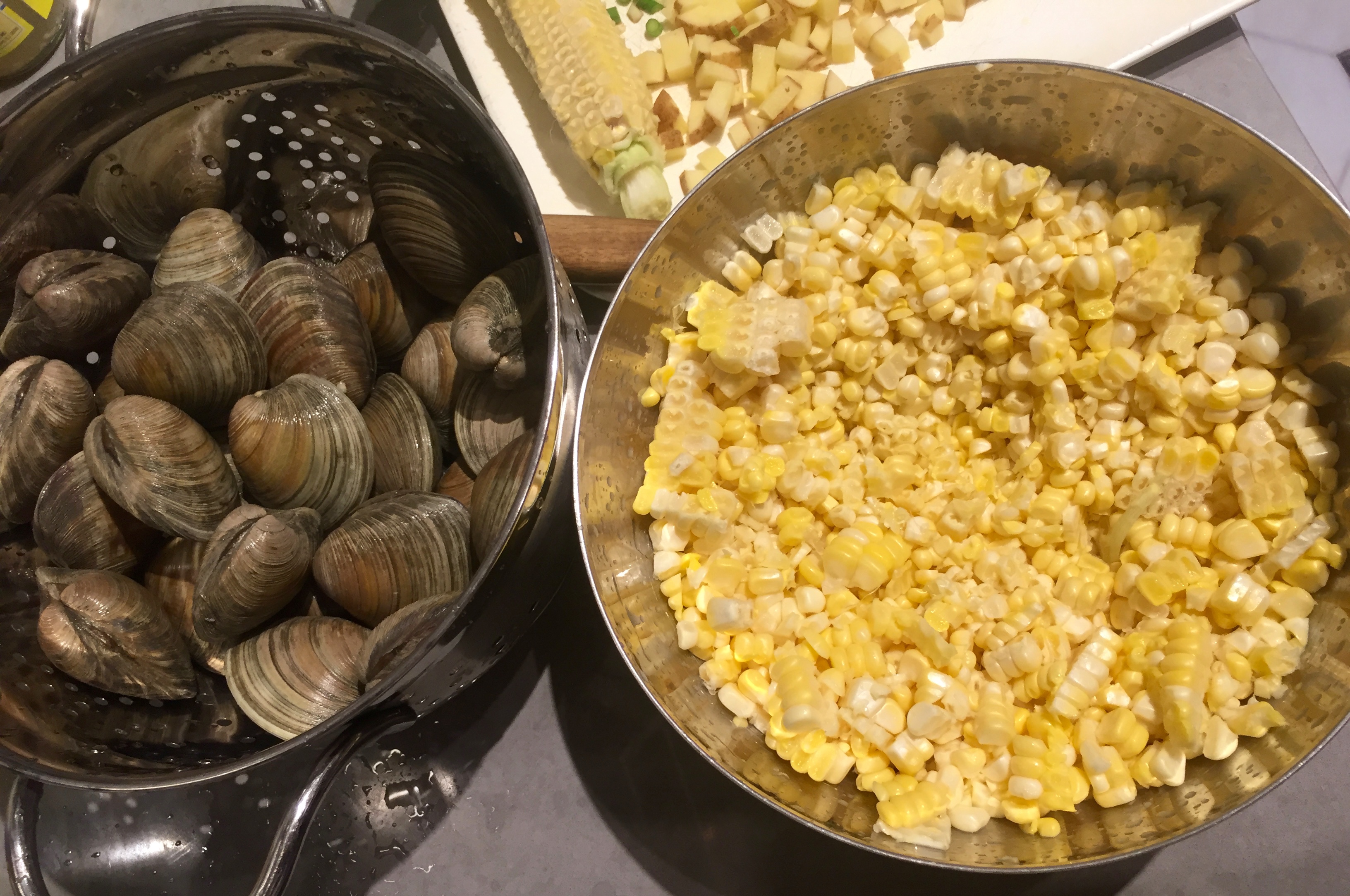 Place each of corn in bowl and cut kernels from the cob. Set aside. Scrub and rinse clams. Set aside.