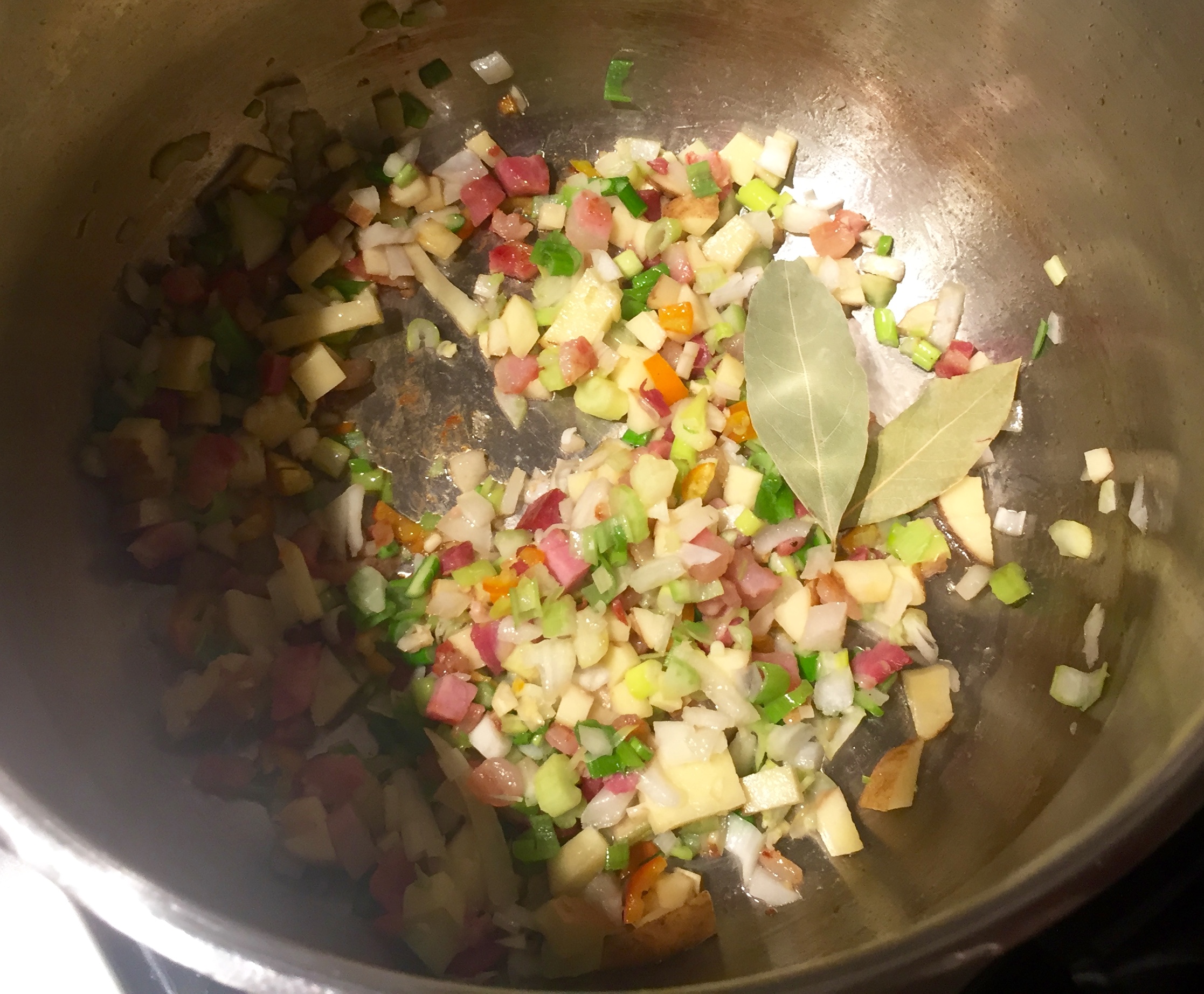 In large stockpot over medium heat, saute pancetta for 5 minutes until slightly brown and fat is rendered. Then lower temp to medium low, add butter. When melted, add onions, celery, hot pepper and garlic. Sprinkle with salt and pepper. Cook for 2 minutes. Add potatoes. Cook for another minute.