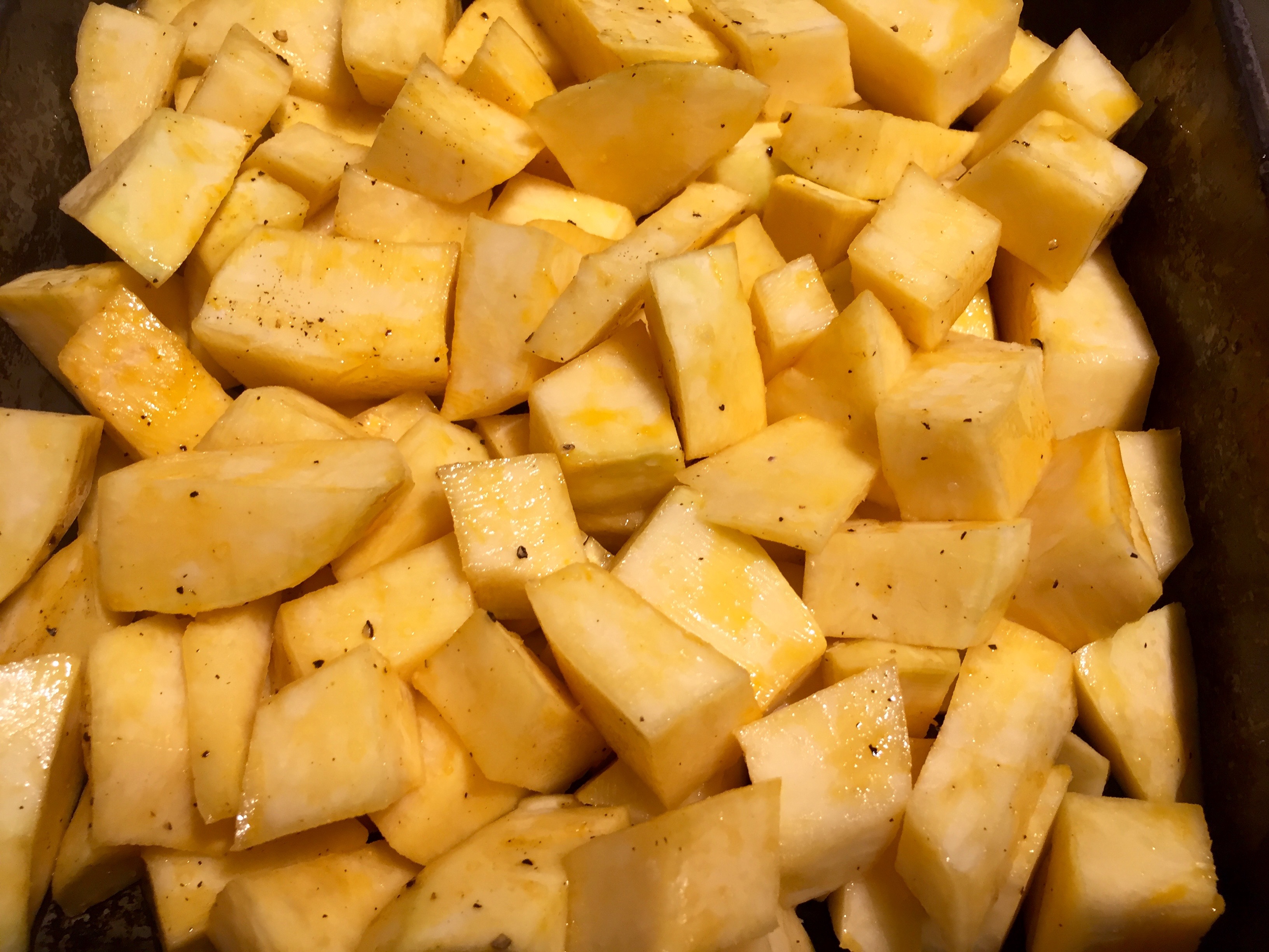 Toss the rutabaga pieces in olive oil or chili oil if you want a little kick (I did). Sprinkle with salt and pepper.